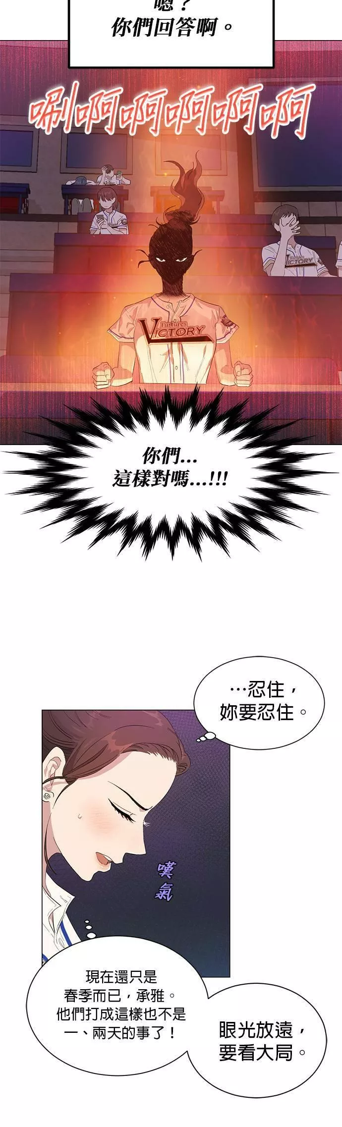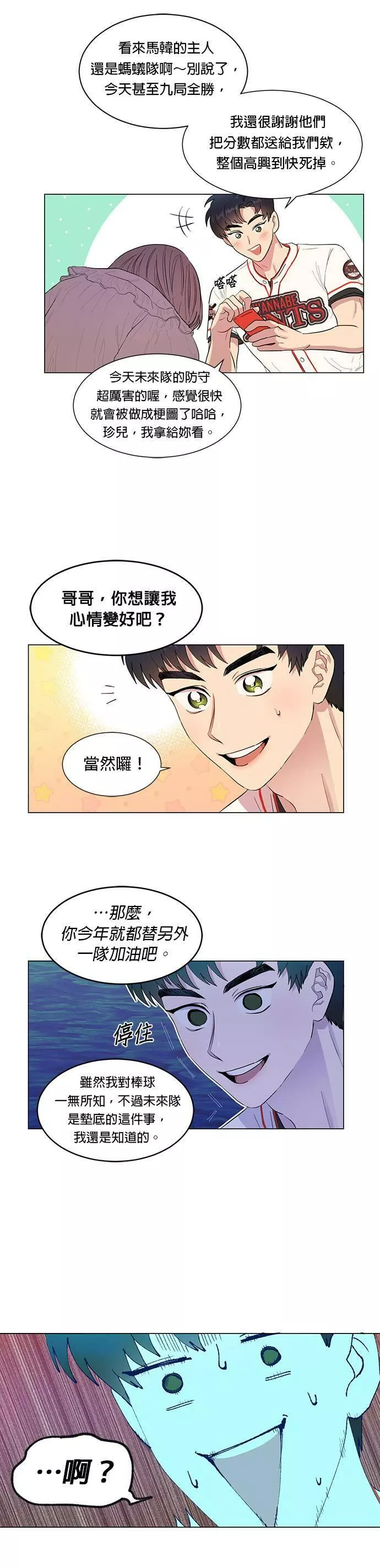 拯救万年垫底棒球队又名,类型为爱情的高人气漫画,漫画简介:【建议15岁以上阅读】 只要和他接吻,就会轰出全垒打,要是XX的话就会...赢球?!万年垫底棒球队「未来胜利队」的球迷申承雅对他们失望透顶,在下定决心要脱粉的那一刻,一时冲动地和坐在隔壁的球迷崔尊接吻...